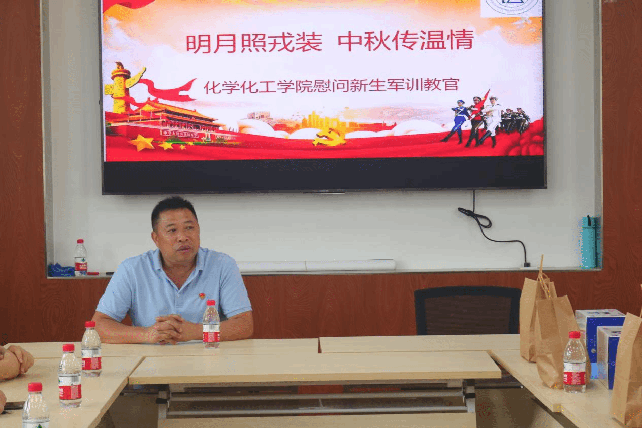 9月14日,“明月照戎装 中秋传温情”,化学化工学院在何鸿燊楼A座403党建活动室开展军训教官传统佳节慰问活动,化学化工学院党委书记邱树华,院长舒绪刚,党委副书记刘勇,辅导员刘亚宁、李珊珊、袁海儒到场开展慰问,承担化工学院新生军训任务的方海燕、卢梓航、朱倩怡、杨明慧四位同志和承担其他营队军训的苏妍淳、邹鑫涛六名学生军训教官代表参加活动。