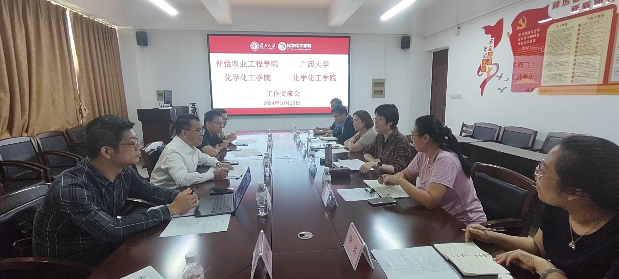 10月22日下午,舒绪刚一行在广西民族大学思源湖校区扬帆楼401会议室参加了座谈,广西民族大学化学化工学院院长谭学才、副院长严军、实验中心主任许海棠、化学工程与工艺系副主任薛兴勇等参加座谈。舒绪刚首先简要介绍了化学化工学院的发展情况及来访目的,接着,谭学才介绍了广西民族大学化学化工学院的基本情况和发展特色,刘绍刚分享了受访学院在学位点建设、研究生招生培养及管理等方面的经验,严军和薛兴勇分别介绍了学院的实验建设与管理及教工党支部情况。随后,双方就学位点及实验室建设进行了热烈而深入的交流。座谈会结束后,谭学才院长带舒绪刚一行参观了教学、科研实验室。