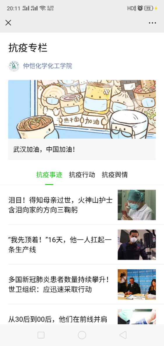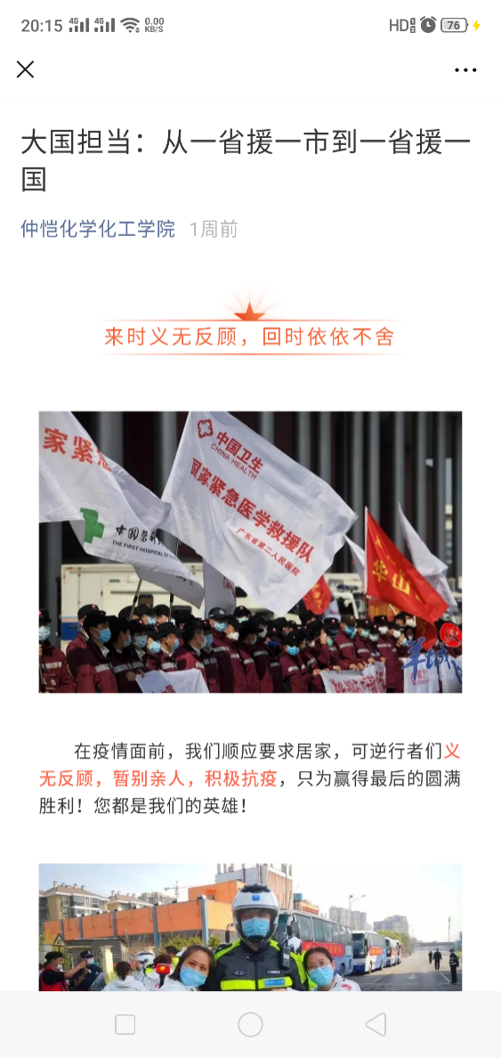 爱国主义教育是永恒的主题。抗疫期间,及时抓住俯首即是的爱国主义题材,例如全国各地涌现出来的抗疫英雄事迹,国内知名人士不计代价地捐款捐物,海外华人华侨心系祖国不辞辛劳搜集并包机送回的祖国的医疗物资等感人事迹,及时推送给学生,润物无声,给学生以爱国主义精神的滋养。学院团委也积极组织学生拍摄武汉加油视频和发表系列文章来抒发对武汉的关切,对祖国的感恩。
