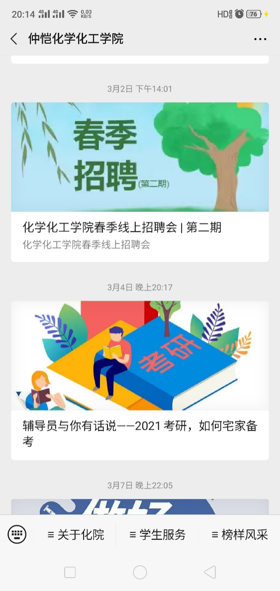 针对毕业生,学院推出“疫情突至,毕业生该如何应对”推文,帮助毕业生理清思路,做好学习与工作计划。针对大三考研学子,学院推出“2021考研,如何宅家备考”推文,引导学生制定复习计划,快速进入学习状态。对于如何择业,学院推出“化学化工学院春季网上招聘会”,分析就业形势,引导学生理性择业就业。