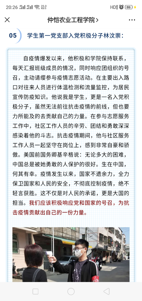 开展“疫情当前,当代大学生的责任与担当”大讨论,教师引导,学生线上积极发表看法。学院更是鼓励广大学生在保证自身安全的情况下,积极参与当地志愿服务和春耕生产服务。学生积极响应号召,或宅家修炼,不给国家添乱,或投入一线志愿者工作中,身体力行,为防控疫情尽自己的一份力。