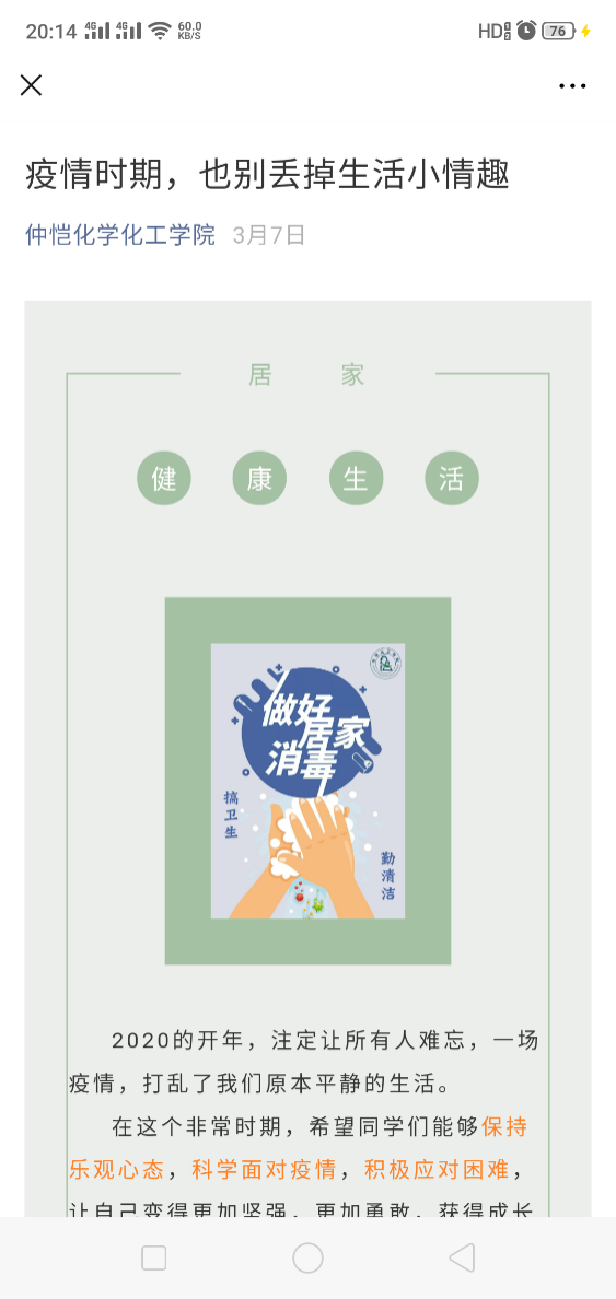 宅家两个月,加上春季阴雨连绵,学院进一步开展学生心理健康摸查,及时疏导学生心理困惑,舒缓焦虑心理。适时推出“疫情时期,也别丢掉生活小情趣”和“从心开始,从身出发”倡导学生在家提高防护意识、做好防护措施,鼓励学生宅家解锁学习和运动新技能;推出“你好,早上好”和 “报复性熬夜,你知道多少” 推文,帮助学生养成良好的作息时间,提高学生学习效率。