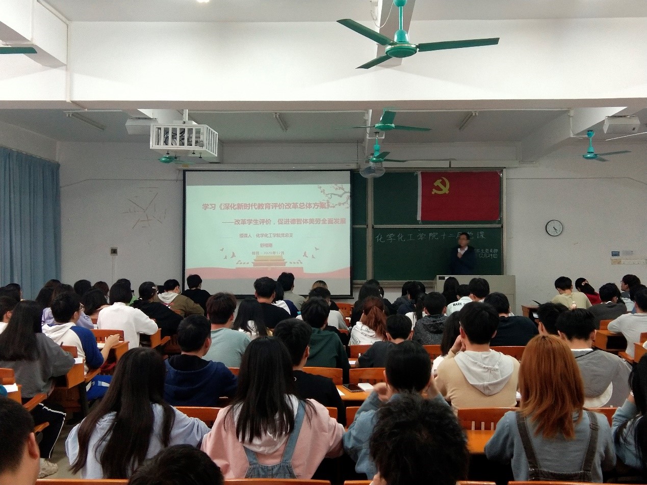 为深入贯彻落实习近平总书记关于教育的重要论述和全国教育大会精神,完善立德树人体制机制,12月29日,化学化工学院在杨钊杨勋楼409课室开展以“学习《深化新时代教育评价改革总体方案——改革学生评价,促进德智体美劳全面发展》”为主题的专题党课。本次专题党课的主讲人为化学化工学院院长舒绪刚。