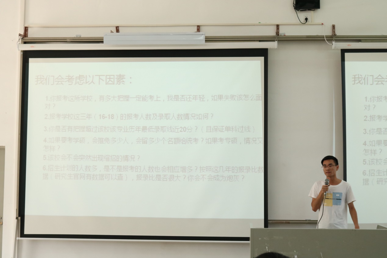 随后,第二位分享考研经验的黄培锦上台发言,让尚在考研之路的同学们明白了考研路漫漫,唯有坚定坚持,方得始终。紧接其后,陈影、潘丽娟相继上台,从各个不同角度阐述了考研的艰辛与不易,所谓“求其上者得中者”,唯有明确目标努力前行,梦想才有可能开花结果。