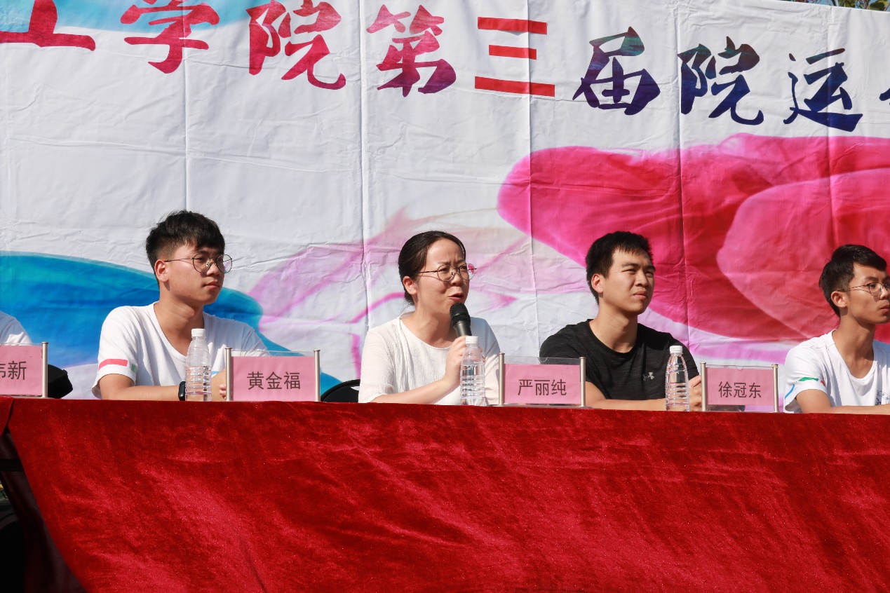 在各班级的入场后,严书记为本次院运会致开幕词。严书记以10月18日第七届世界军人运动会为例子,强调习近平总书记对高校德智体美劳全面发展的要求,希望全体化工学子能在本次院运会中增强体质与收获快乐。争取在各个体育项目取得突破。