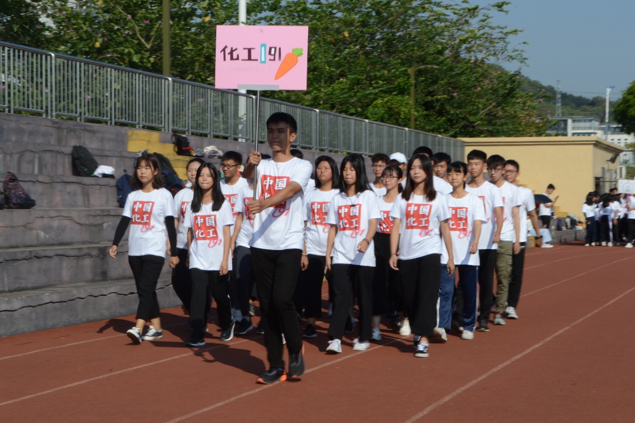 开幕式上,18、19级各班排成整齐的方阵,逐一入场。每个班级的成员都身穿着各具特色的班服,迈着雄赳赳气昂昂的步伐,依次走向主席台并进行各个班级的展示,淋漓尽致的体现出化工青年蓬勃的朝气。