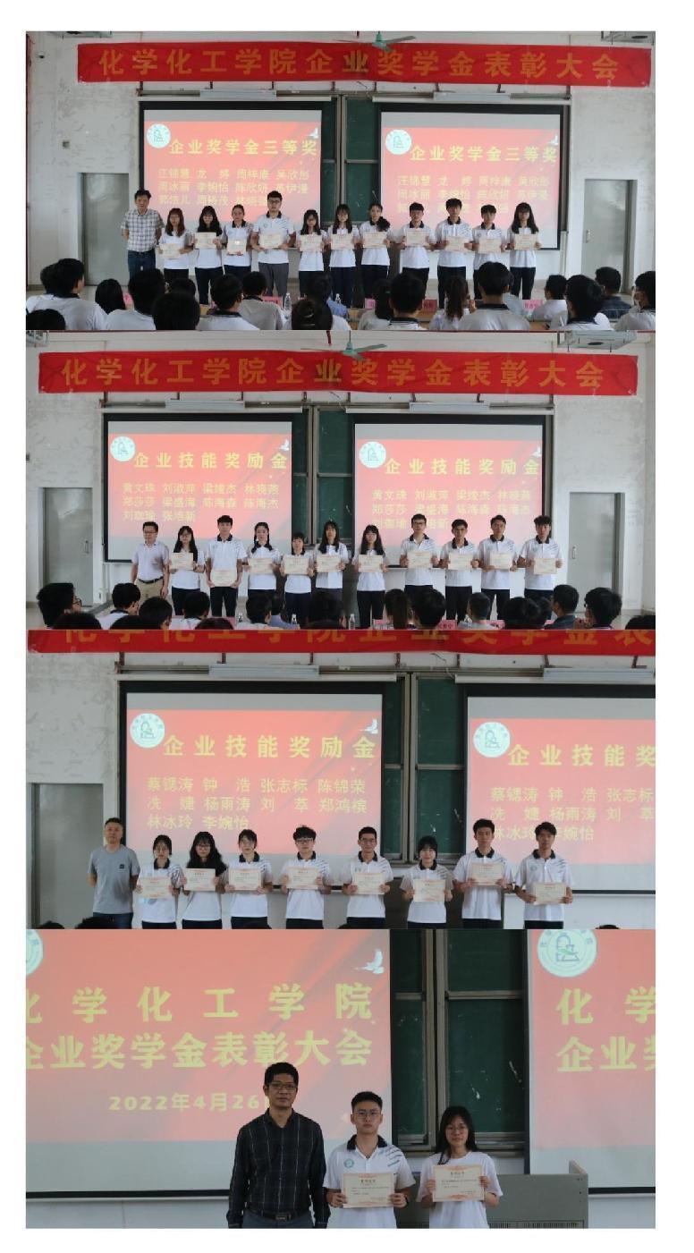 紧接着各位领导为获奖同学进行颁奖。由党委书记邱树华为获得企业奖学金一等奖的同学颁奖;院长舒绪刚为获得企业奖学金二等奖的同学颁奖;党委副书记严丽纯和高分子与材料系系主任周向阳为获得企业奖学金三等奖的同学颁奖;应用化学系系主任程杏安和化学工程与工艺系系主任张步宁为获得企业技能竞赛奖励金的同学颁奖;应用化学系系副主任杨富杰为获得班级奖学金的同学颁奖。