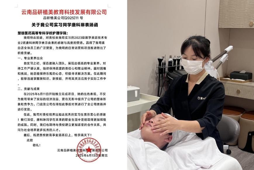 近日,楚雄医专护理学院收到一封来自云南品妍植美教育科技有限公司的表扬函,函中盛赞了护理学院2023级医学美容技术2班的唐科琳同学在实习期间的优异表现。2025年4月,唐科琳同学借助护理学院精...