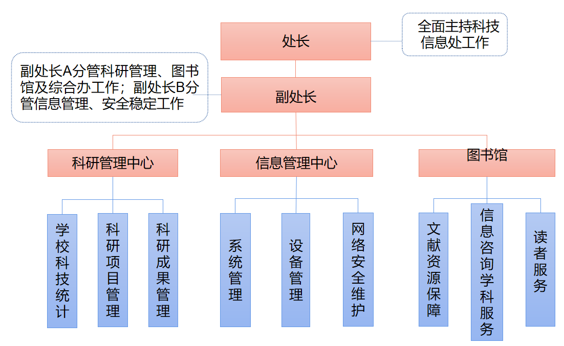 2021年2月学校机构改革,成立楚雄医专科技信息处,承担原科技处、信息中心、图书馆的工作职责,主要负责万象城科学研究管理服务、信息技术管理服务、图书馆的工作。科技信息处现有教职工19 人,其中研究生学历9人。设处长一名,副处长两名,内设科研管理中心、信息管理中心、图书馆、综合办公室,面向全校开展具体业务。